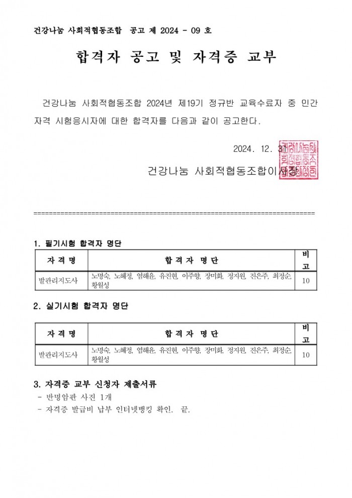 19기 민간자격(발관리지도사) 합격자 공고 및 자격증 교부