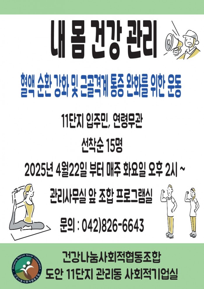 본점 소재 11단지 입주민을 대상으로 혈액순환강화와 퇴행성 근골격계 통증완화를 위한 건강관리 강습을 매주 화요일 1회 본점 프로그램실에서 실시하기로 하였습니다 .. 보다 많은 분들이 건강해지시길 기대하면서 ...