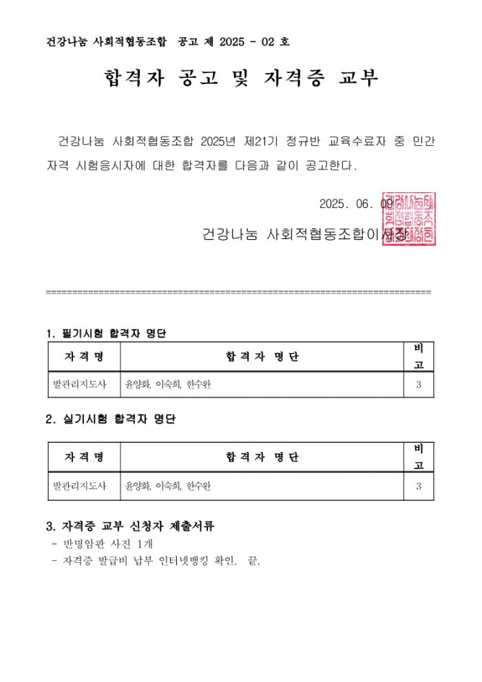 21기 민간자격(발관리지도사) 합격자 공고 및 자격증 교부