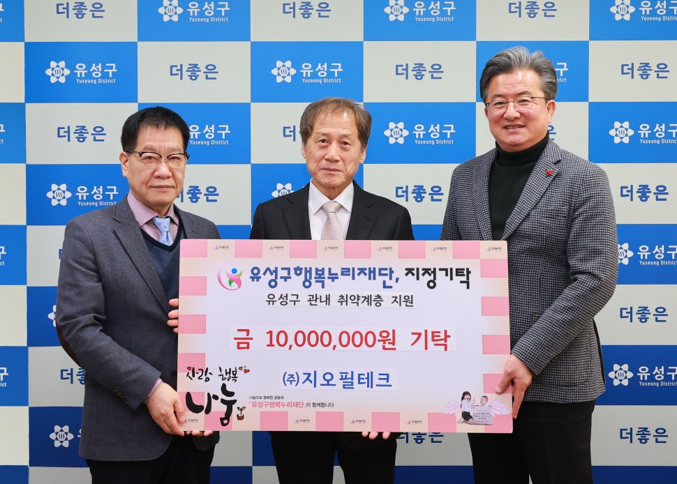 대전 유성구(구청장 정용래)는 23일 (주)지오필테크(대표이사 이민수)가 취약계층 지원을 위해 유성구행복누리재단에 후원금 1,000만원을 기탁했다고 밝혔다.