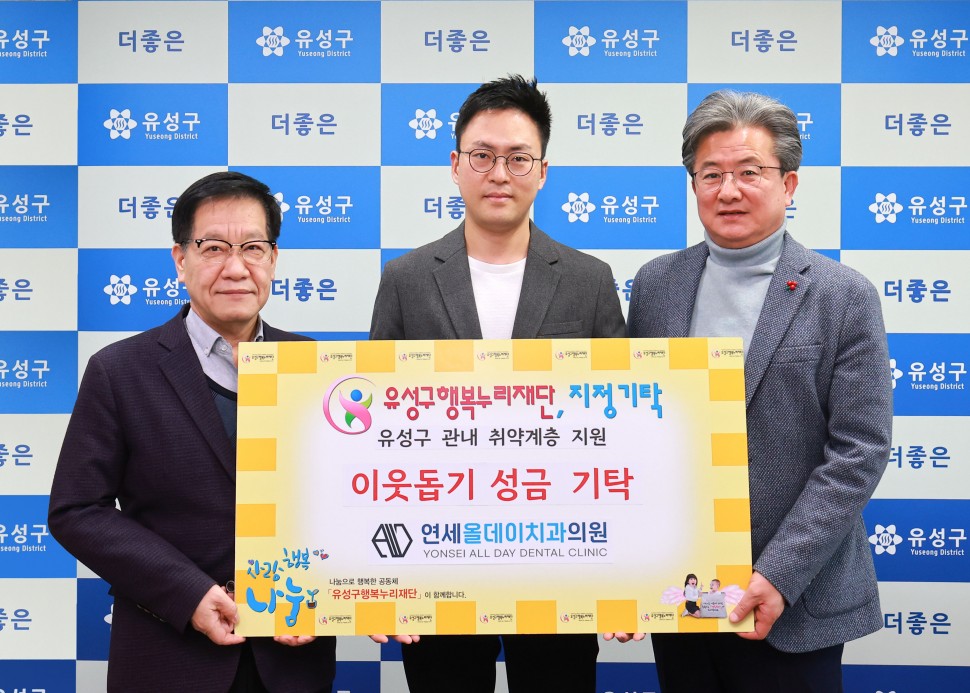대전 유성구(구청장 정용래)는 19일 연세올데이치과의원(대표원장 정열)이 유성구행복누리재단에 후원금 300만원을 기탁했다고 밝혔다.