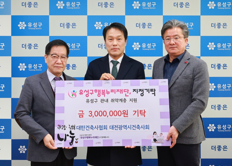 대전 유성구(구청장 정용래)는 17일 구청 행복사랑방에서 대전건축사회(회장 조한묵)로부터 취약계층 지원을 위한 후원금 300만원을 기탁받았다고 밝혔다.