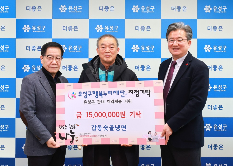 대전 유성구(구청장 정용래)는 16일 갑동숯골냉면(대표 김현태)에서 취약계층을 위한 후원금 1,500만원을 기탁했다고 밝혔다.