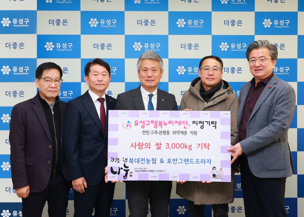 대전 유성구(구청장 정용래)는 10일 북대전농협(조합장 심청용)과 호반그랜드프라자(공동대표 김선춘, 유병창)로부터 취약계층 지원을 위한 백미 3,000kg을 유성구행복누리재단에 기탁받았다고 밝혔다.